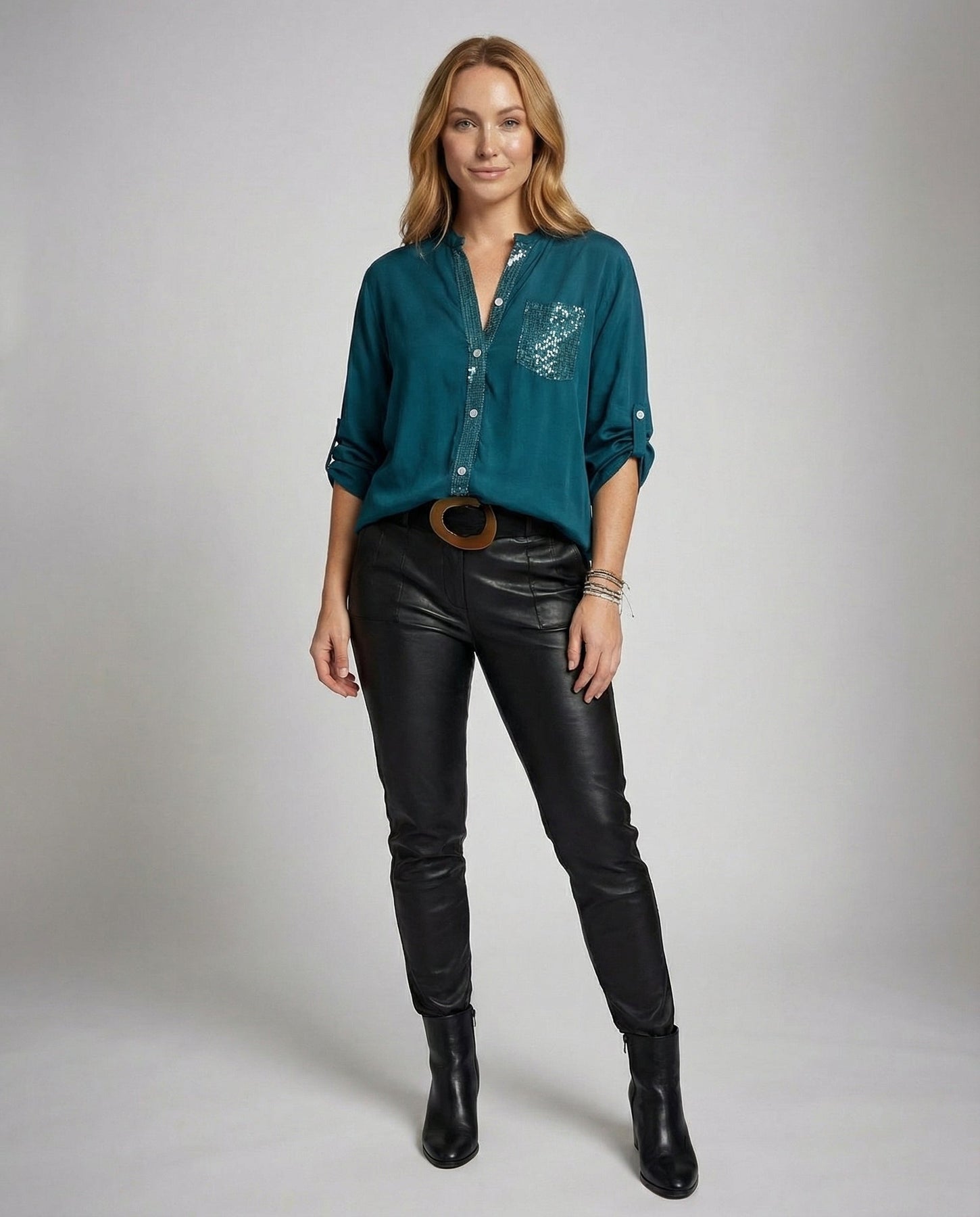The glitter blouse for women combines effortless style with a hint of elegance. This featherweight top offers a comfortable fit, while the sparkling sequin pocket elevates any ensemble with flair.