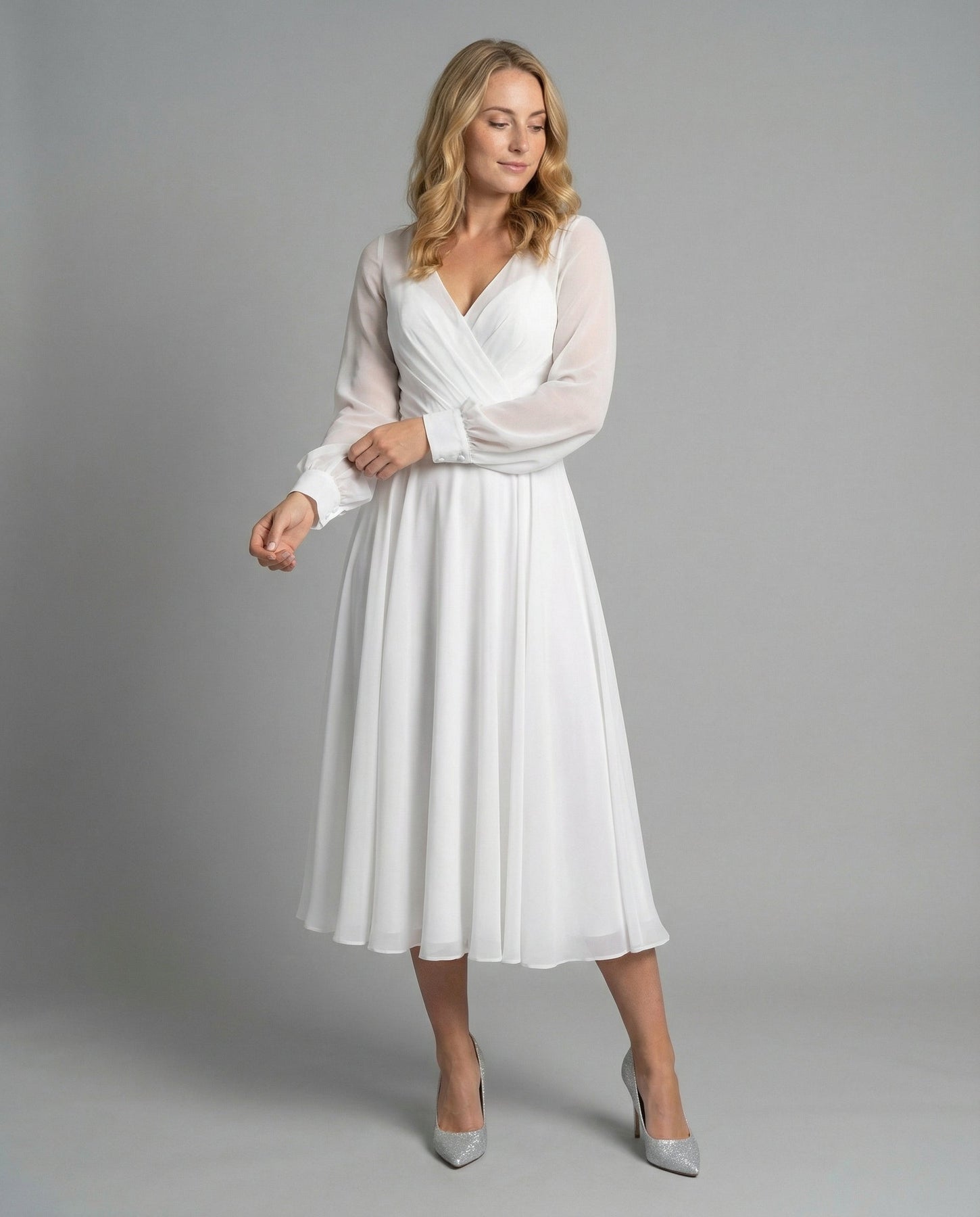 This chic chiffon flutter dress combines airy lightness with a sophisticated cut for special occasions. The delicate fabric ensures great comfort and a flattering silhouette.