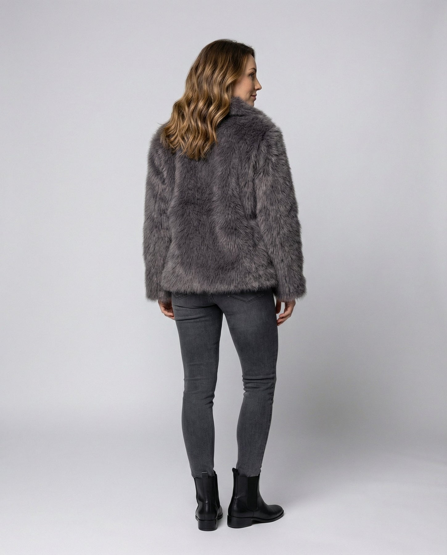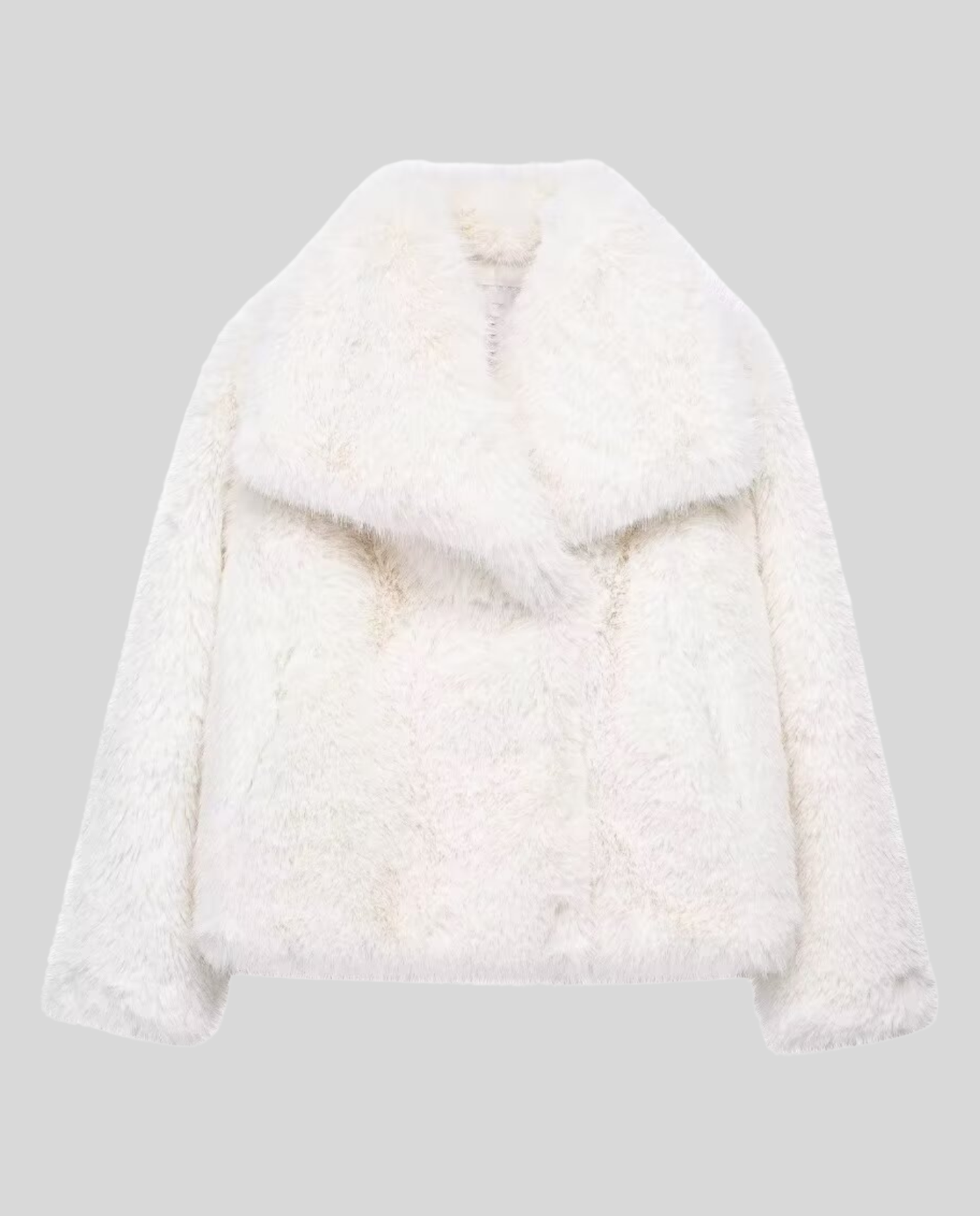 The Faux-Fur Shawl Collar Jacket impresses with its oversized shawl collar and chic design. Made from soft synthetic fur, it delivers comfort and warmth during chilly days.