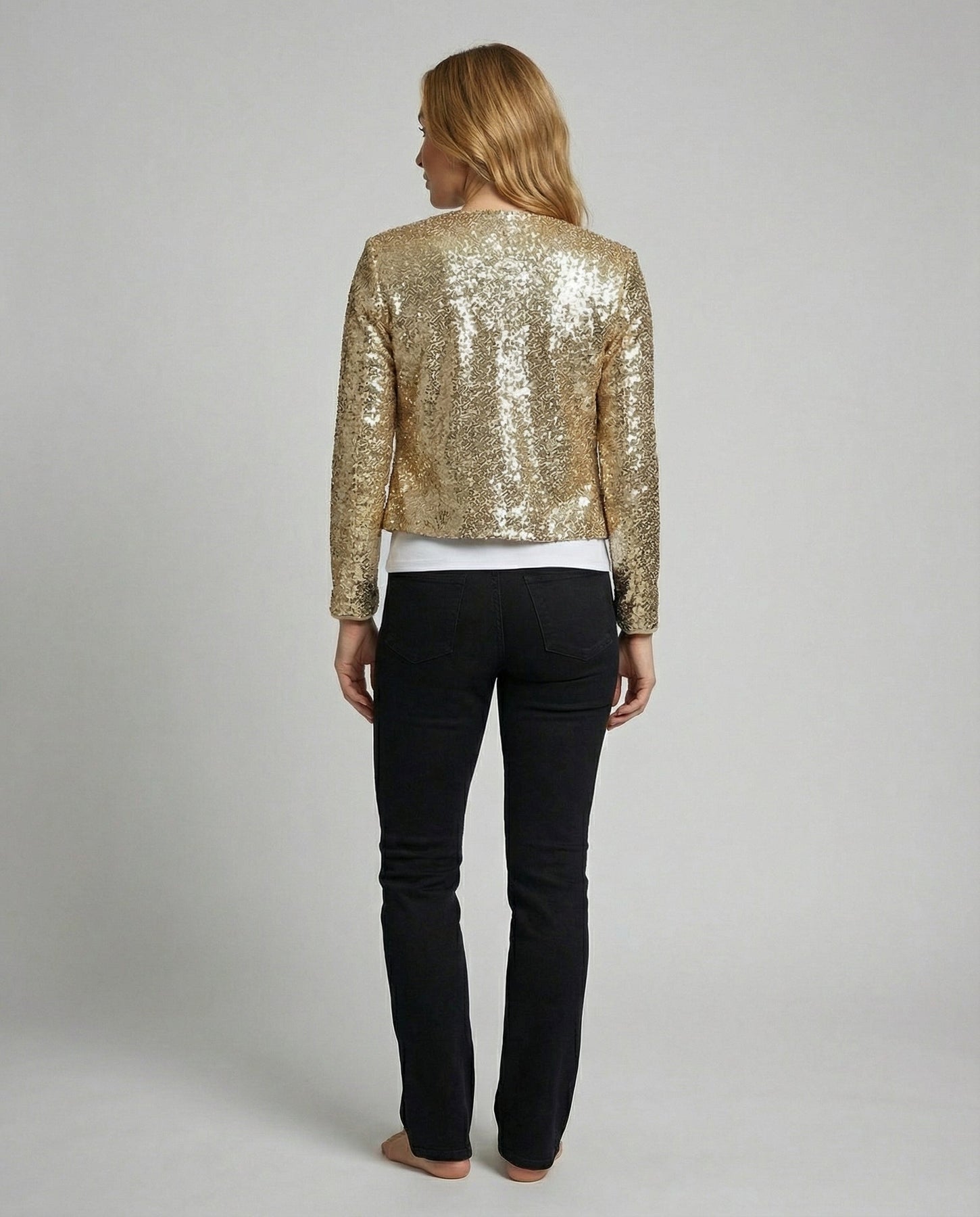 This sophisticated glitter jacket for women is the ideal choice for chic evening appearances. The round neckline and long sleeves create a graceful silhouette, while the shimmering fabric adds a touch of elegance to any outfit.