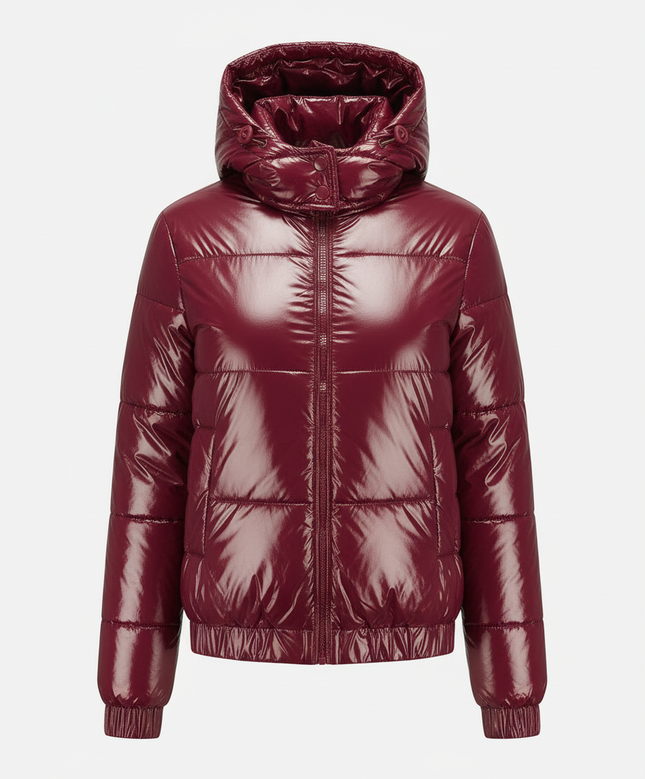 This glossy women's puffer jacket seamlessly blends contemporary style with practicality. Featuring a detachable hood, insulating padding, and handy pockets, it ensures maximum comfort during chilly days.