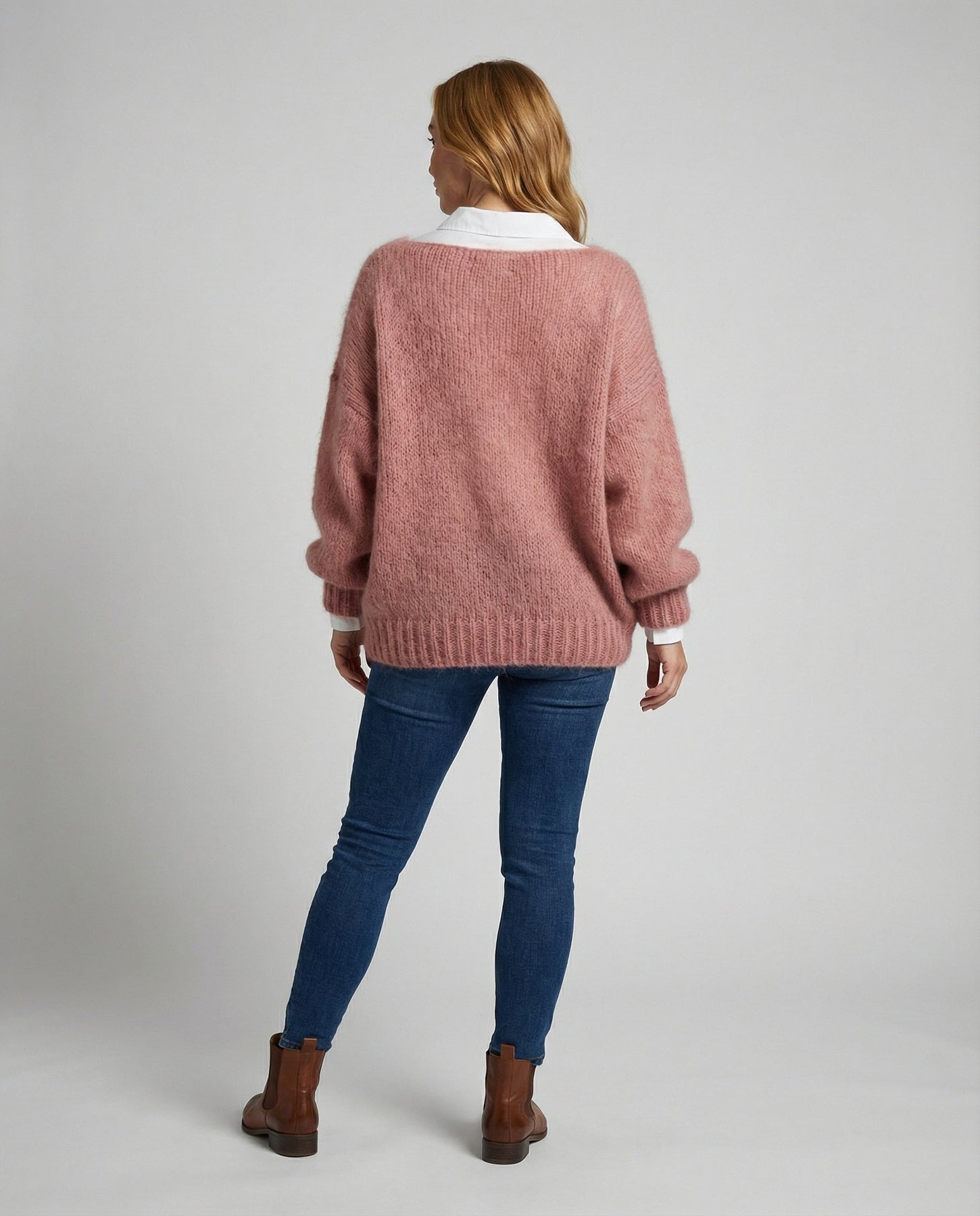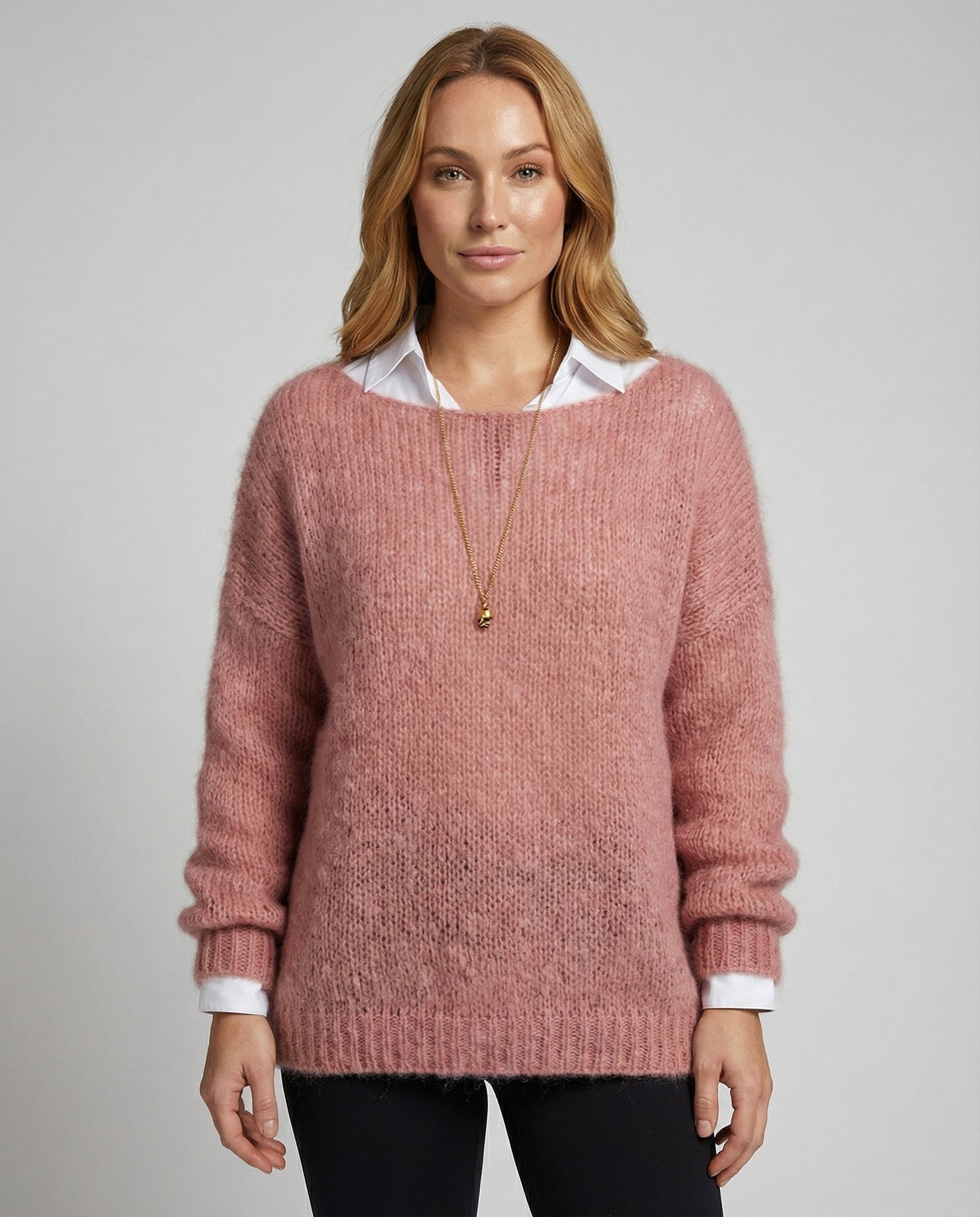 The Heidi-Mode Luxe Mohair Sweater combines chic comfort with a lavish wearing experience. Its gentle pink shade and relaxed, oversized fit make this sweater a sophisticated addition to any wardrobe.