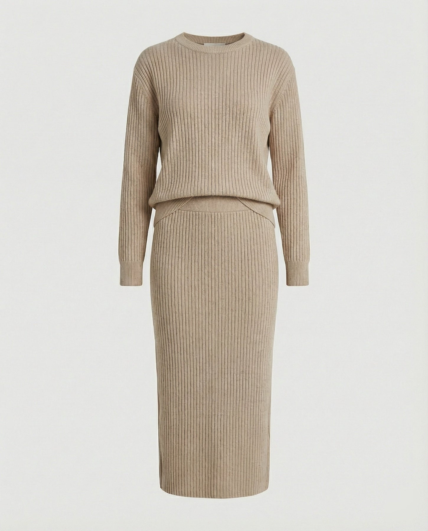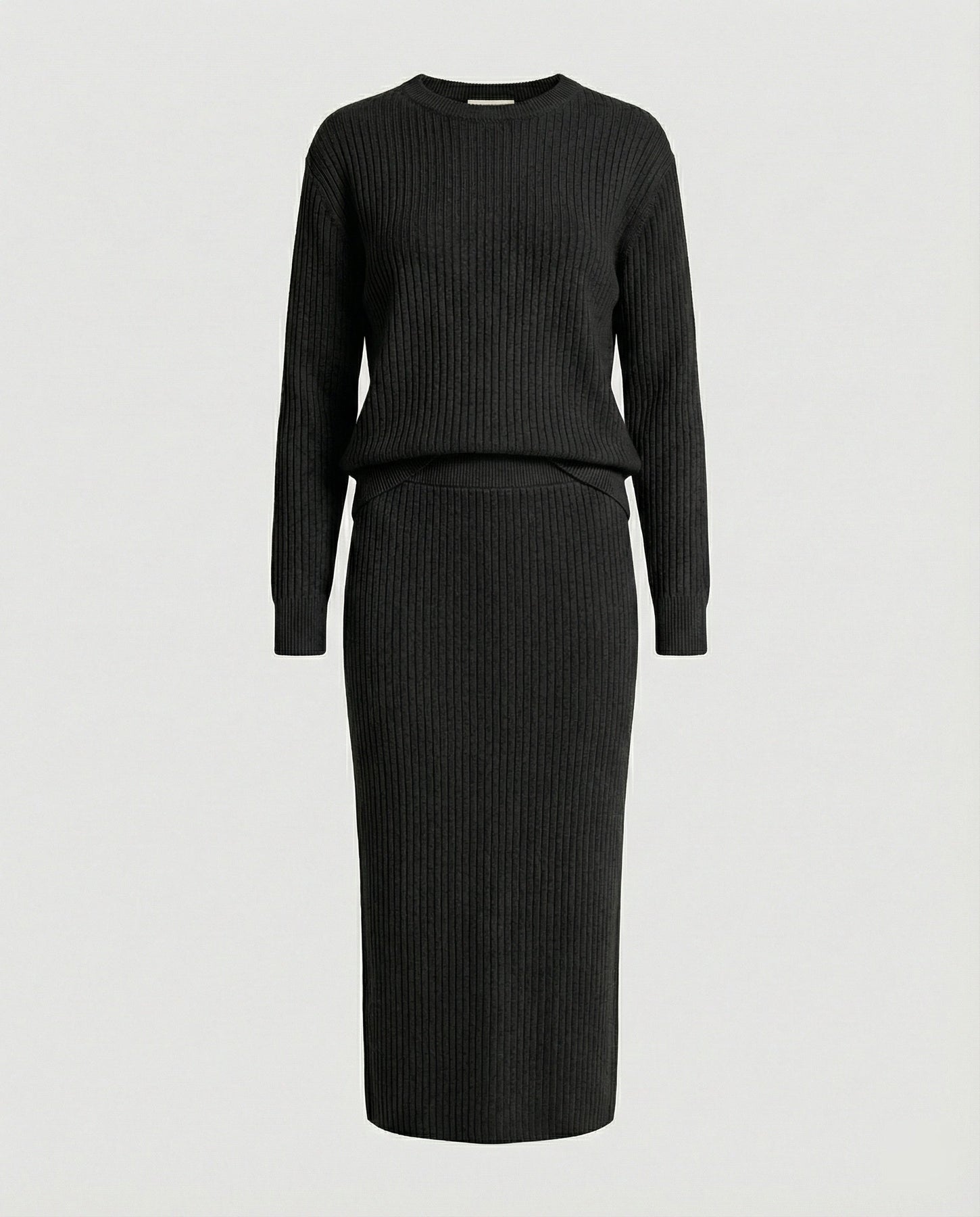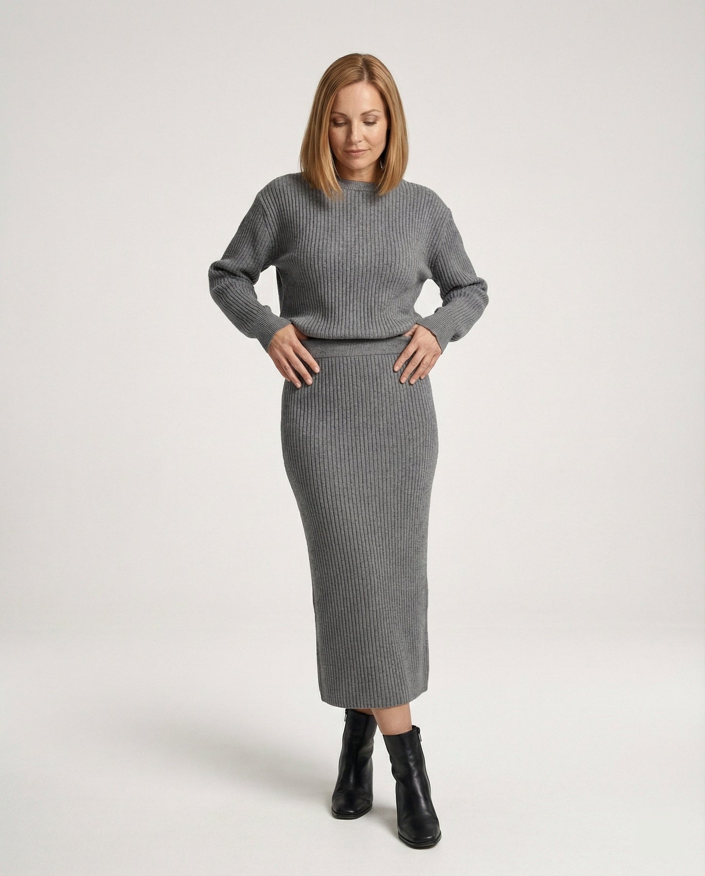 This stylish knit set featuring a sweater and skirt impresses with its seamless blend of comfort and style. The coordinated cut enhances a feminine silhouette, making the set versatile for various occasions.