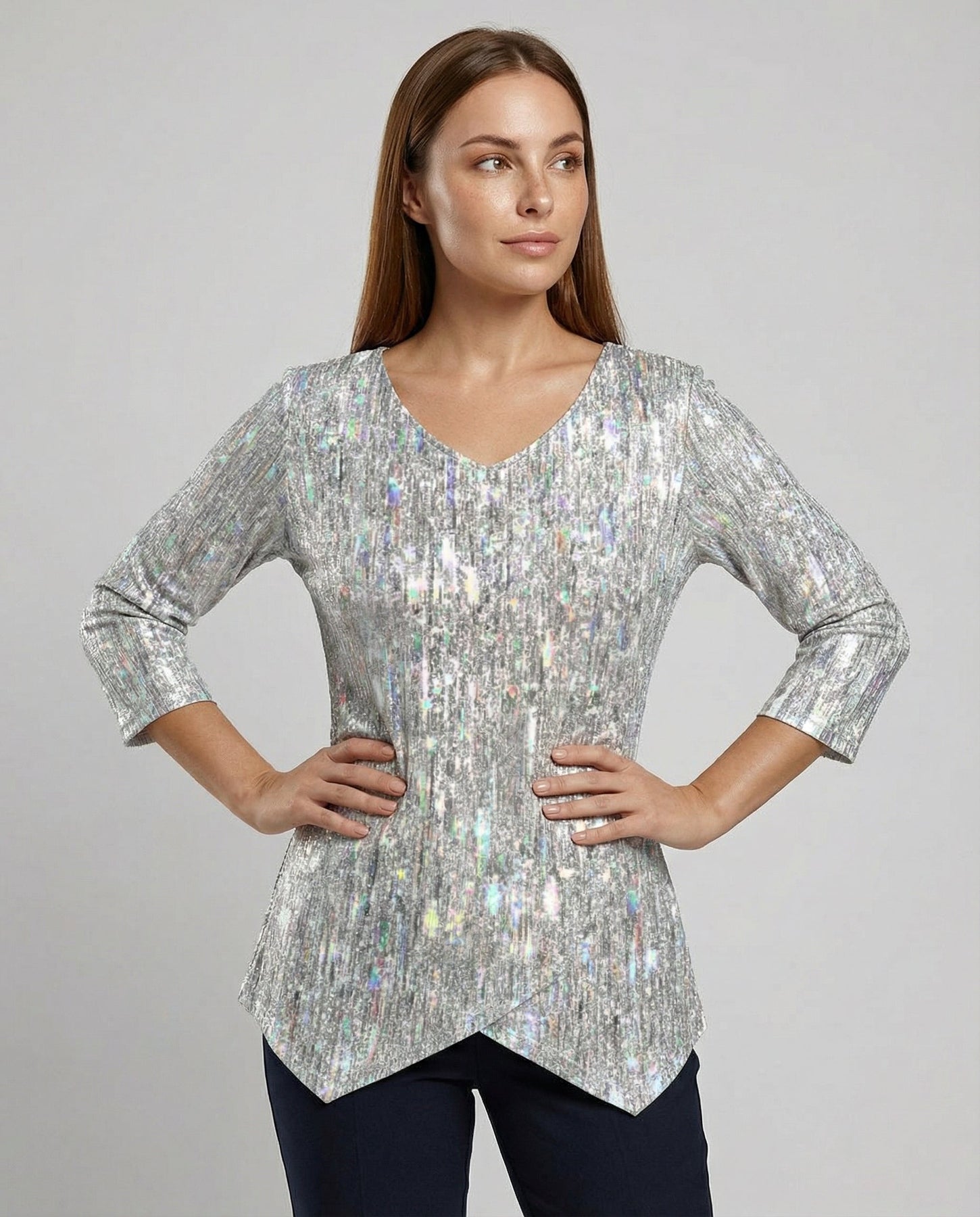 This stylish women's top featuring a V-neckline impresses with its comfortable fit and classic design. Perfect for everyday wear, the office, or special occasions.