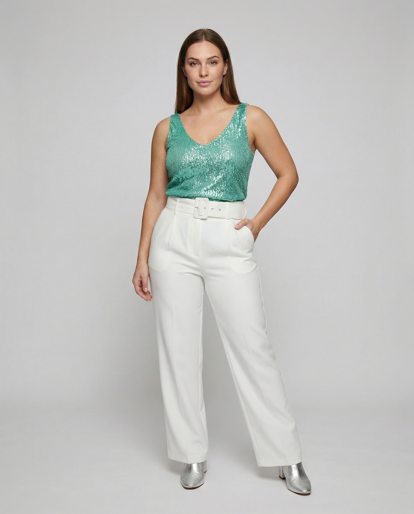The shimmering V-neck top adorned with sequins adds a touch of sophistication to any ensemble. The all-over sequin design captures the light beautifully, creating a dazzling effect for special occasions. The V-neckline flatters the figure, while the sleeveless design offers comfortable wear.