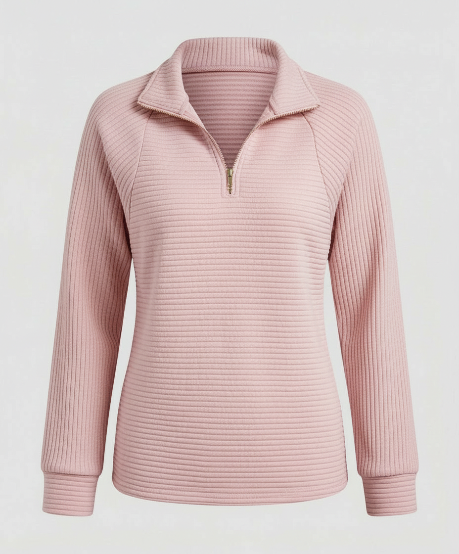The women's V-neck sweater seamlessly combines elegance and versatility within a contemporary design. With the zipper at the neckline, you can customize the look to your liking, making it a perfect match for jeans or dress pants.