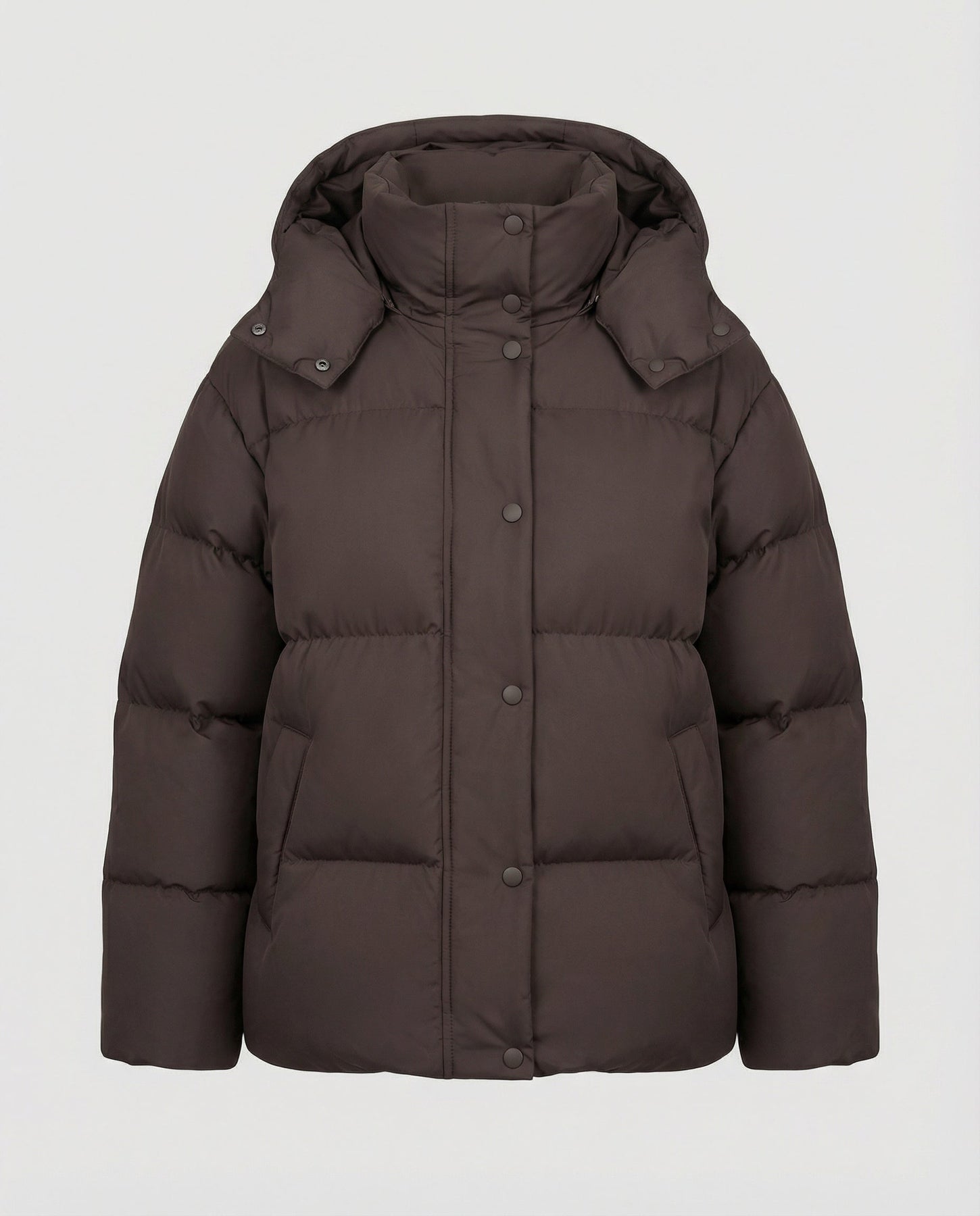 This oversized women's puffer jacket combines contemporary style with excellent warmth for chilly days. Its high collar, detachable hood, and relaxed fit provide both comfort and a fashionable appearance.