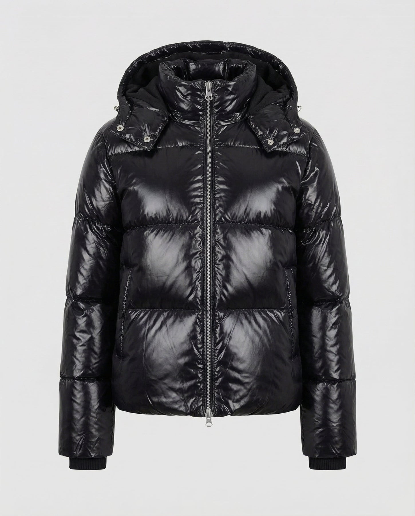 The women's puffy jacket with a hood combines warmth, style, and functionality for chilly winter days. The fitted shape and cropped length create a contemporary silhouette, while the high-quality insulation ensures optimum comfort.